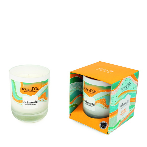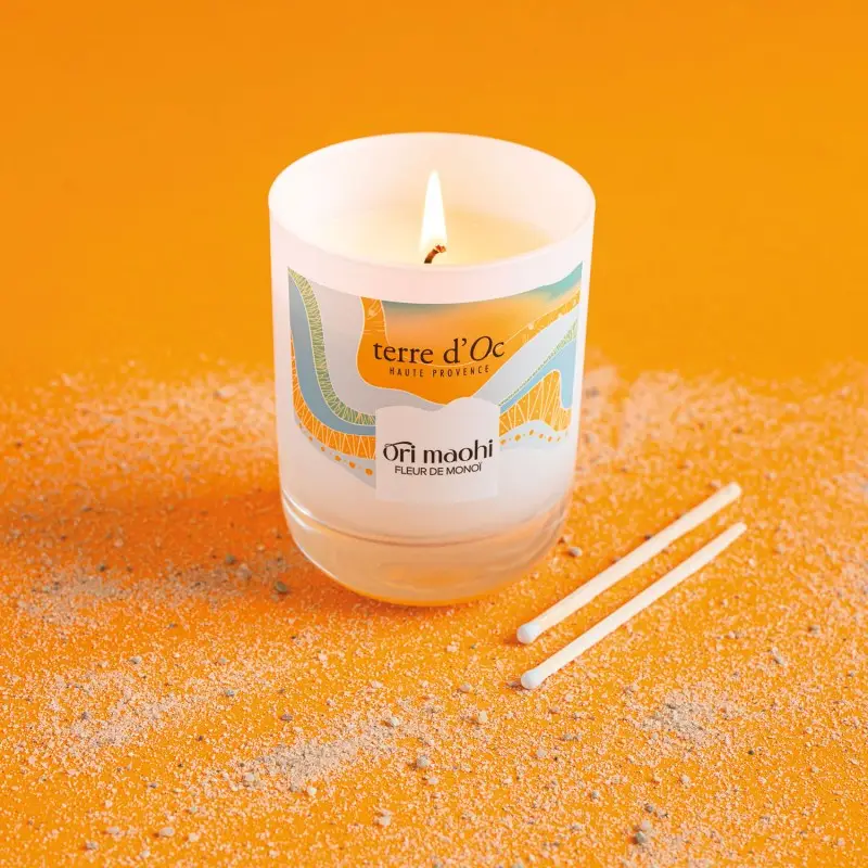 Une bougie parfumé aux effluves enivrants de fleurs de monoï, d’ylang-ylang sur un fond de vanille et de coco… Comme un appel à la sensualité, le doux effleure ment du soleil sur le sable, le murmure apaisant des vagues se brisant sur la plage, une invitation à une atmosphère baignée de lumière solaire…