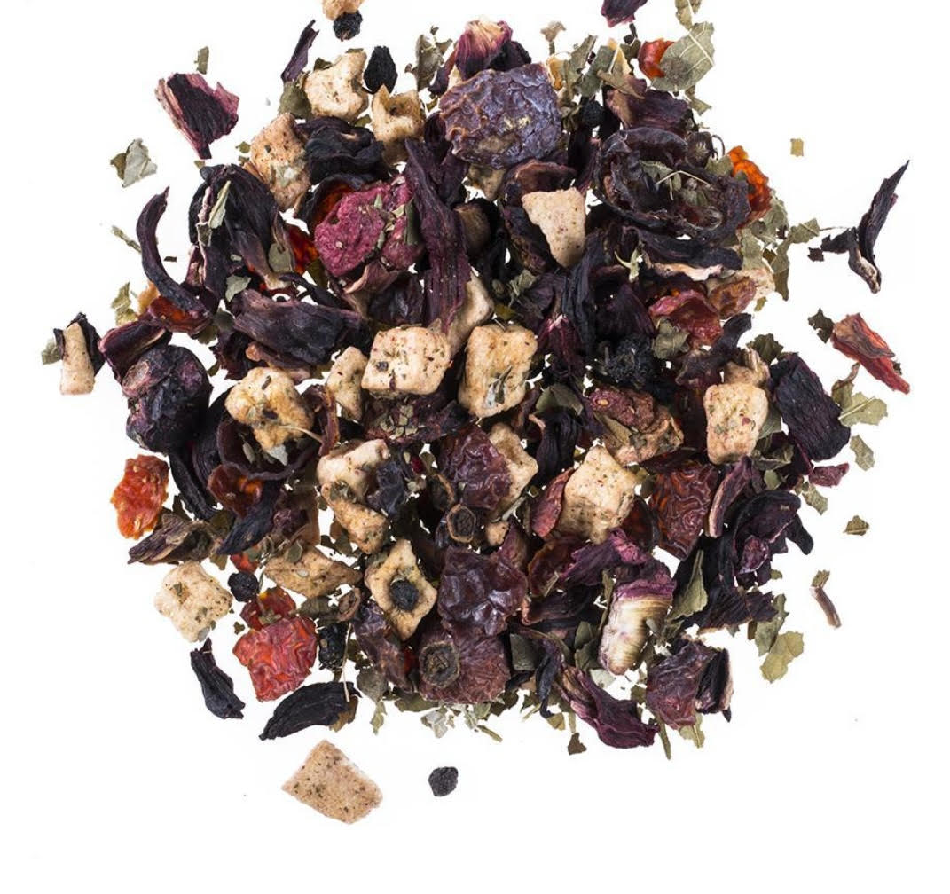 Hibiscus, morceaux de pomme, écorces de cynorrhodon, baies de sureau, feuilles de mûre, arôme, granulés de framboise (sirop de glucose, sucre de canne, framboise, alginate de sodium), cassis, morceaux de fraise et de mûre lyophilisés.